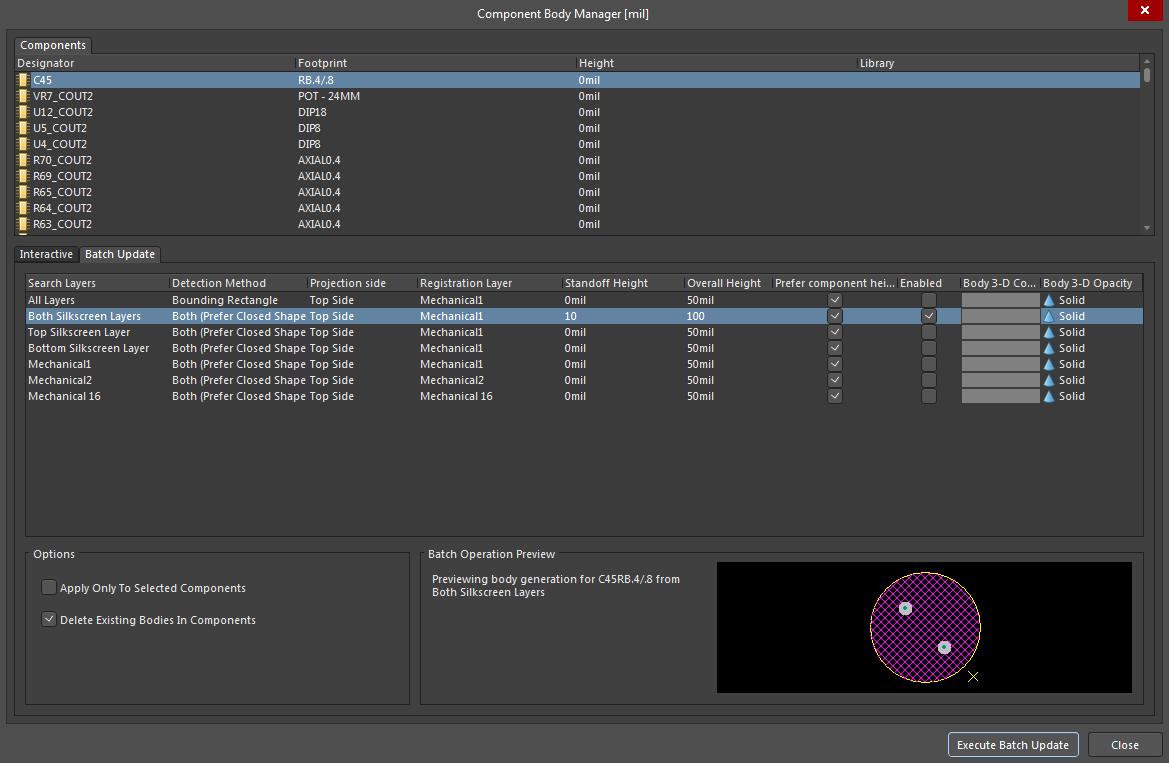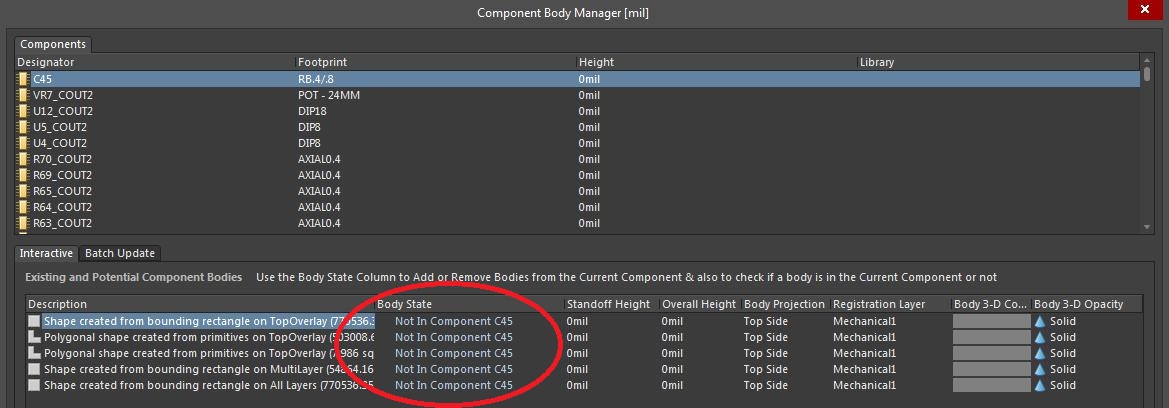 组件主体管理器使您能够使用板上所有板的3D主体。您可以在上图中看到对话框的顶部列出了每个组件。右下方是“交互式”和“批量更新”的选项卡。在上图中,交互式选项卡处于活动状态,它显示所选部件的“正文状态”的状态。您可以看到没有列出任何3D主体。