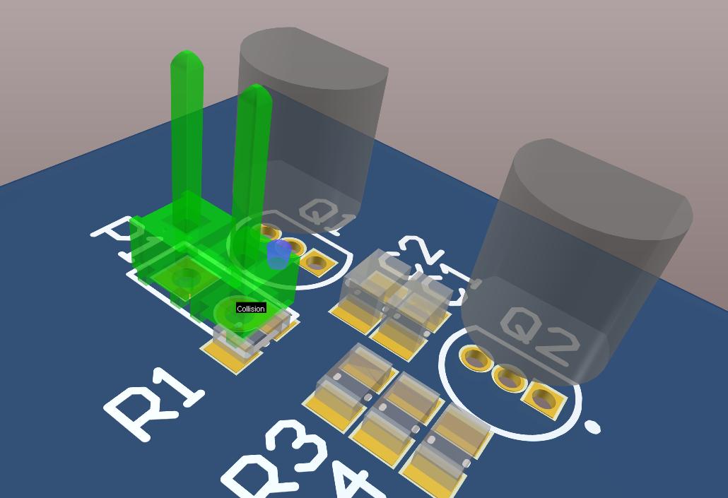 在下图中,我们已经选择了R1以便移动它。目前,它位于连接器上,连接器显示绿色的明显DRC放置错误,并显示“碰撞”警告。就像在2D中一样,当您在棋盘上移动时,您可以立即获得错误的在线DRC反馈。